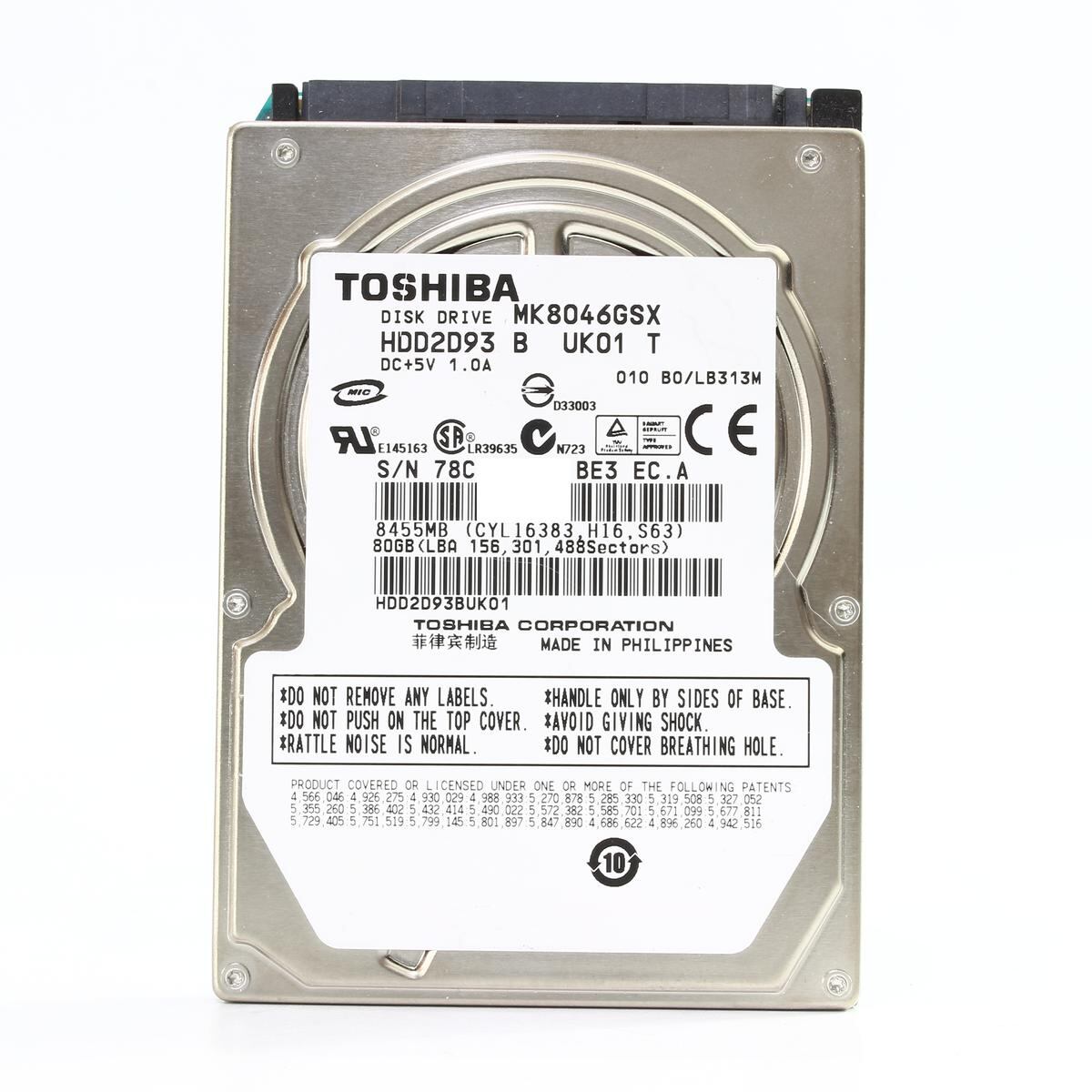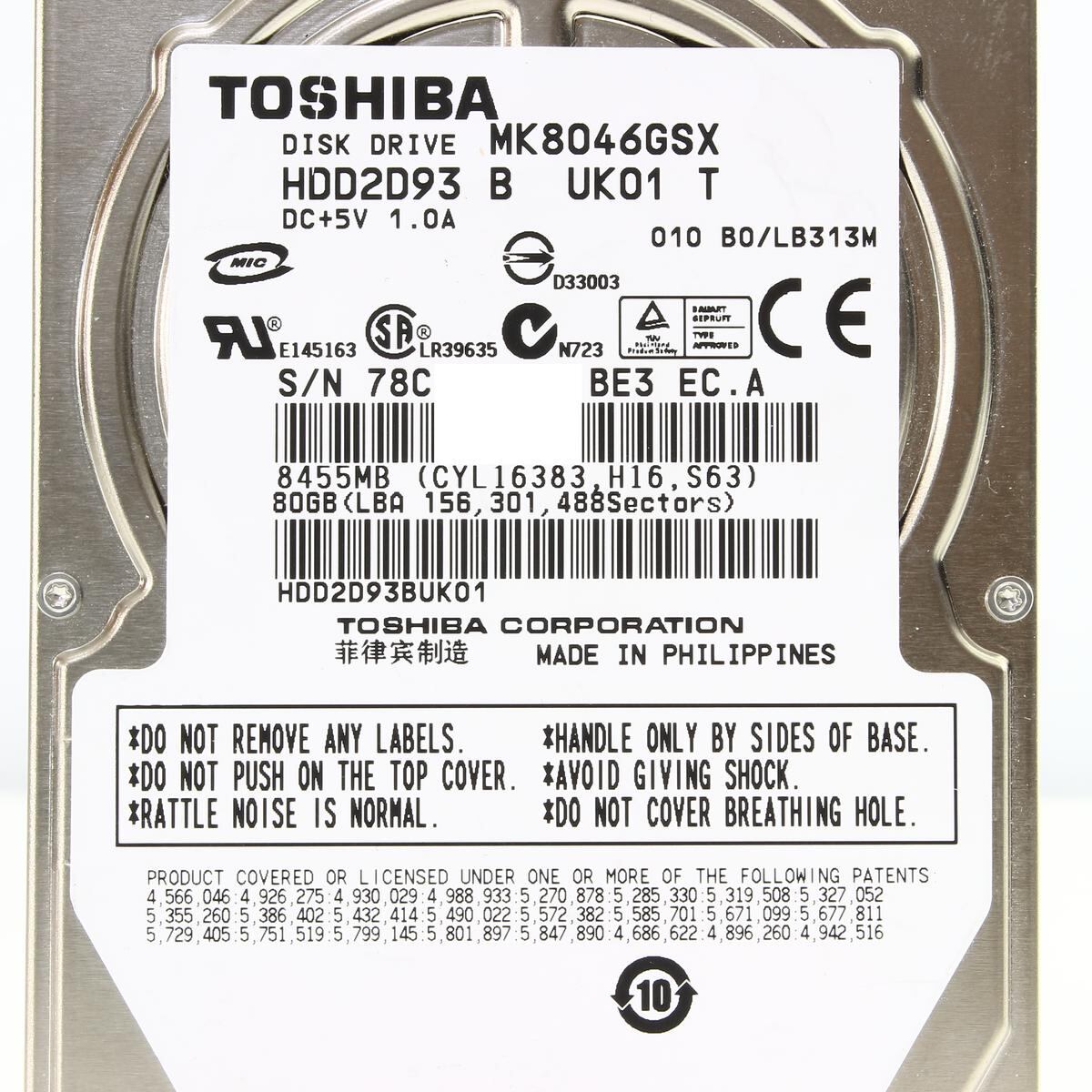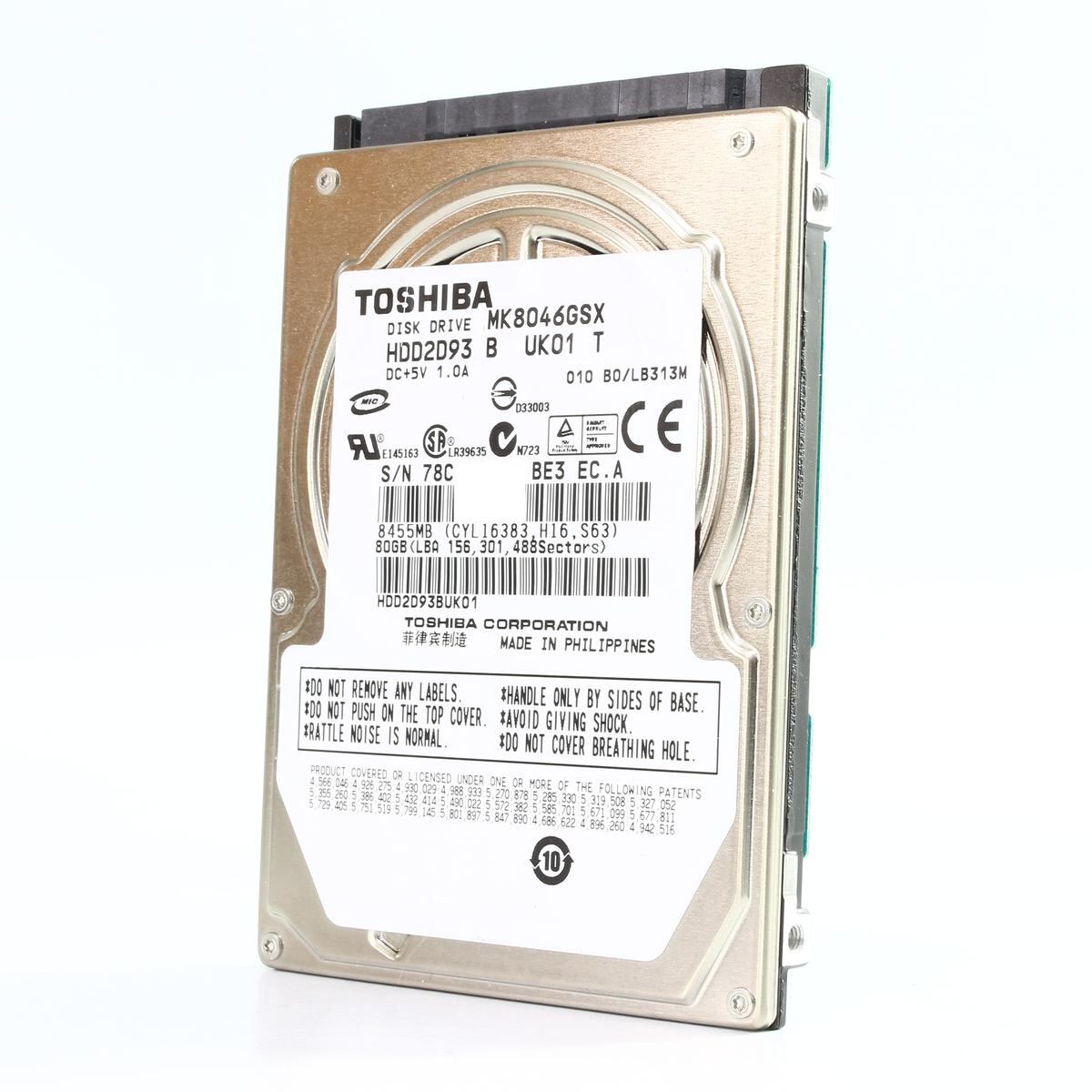 TOSHIBA|80GB|MK8046GSX|HDD2D93|5400rpm|Serial ATA300|HDD|2.5インチ|9.5mm|東芝|200285