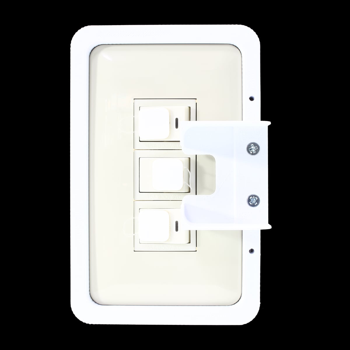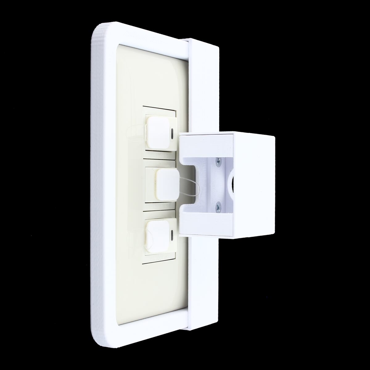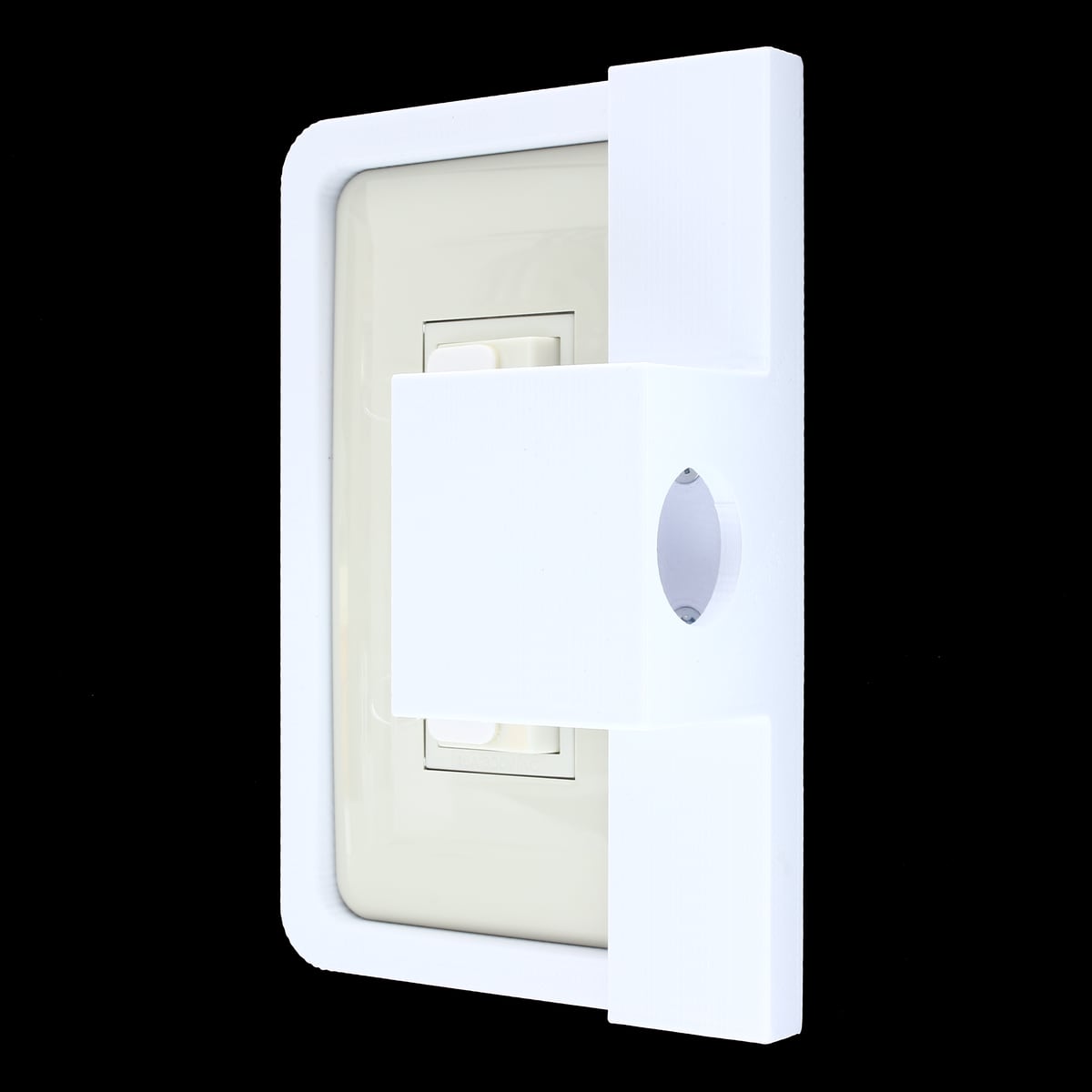 SwitchFrameはソケット部分と壁のスイッチカバーに取り付ける枠部分から成り、接着剤で固定し一体化しております。