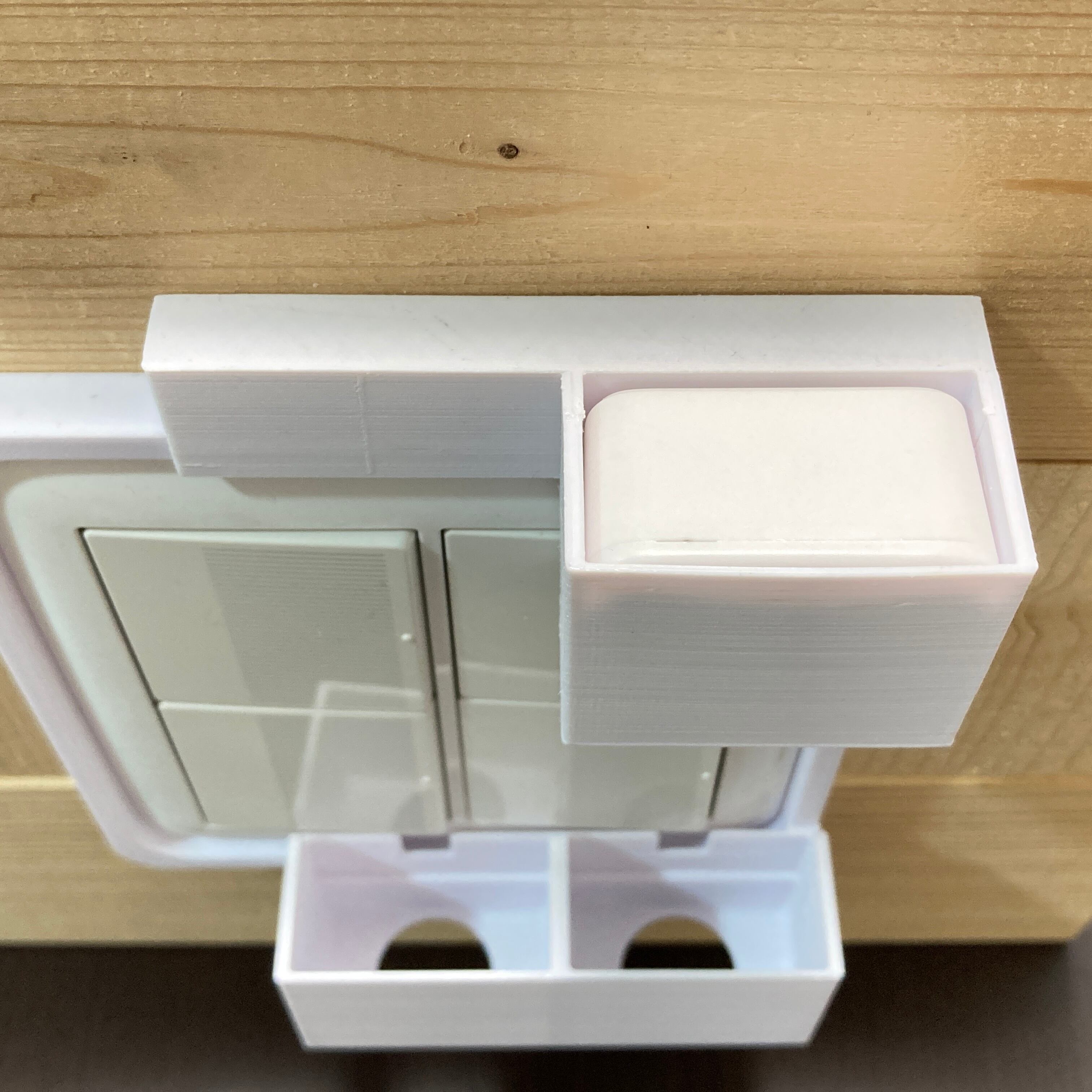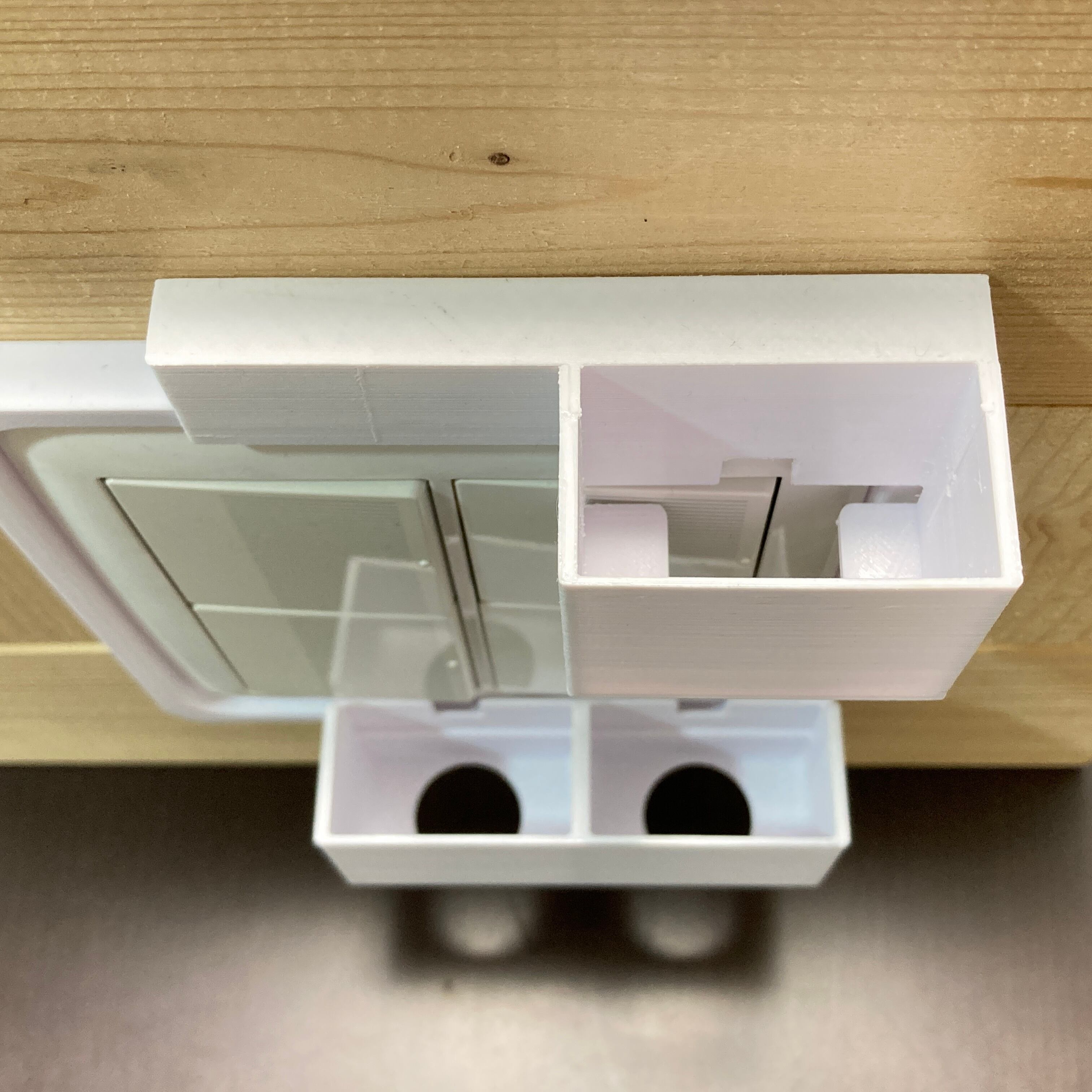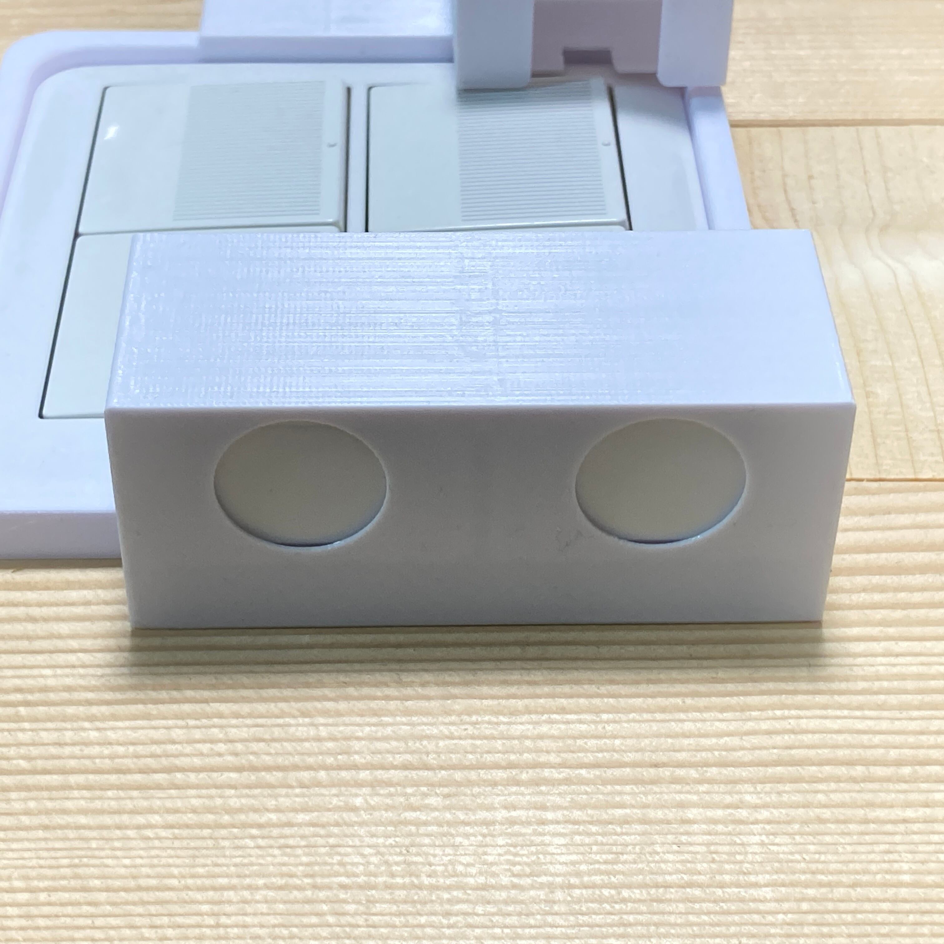 SwitchFrameはソケット部分と壁のスイッチカバーに取り付ける枠部分から成り、接着剤で固定し一体化しております。